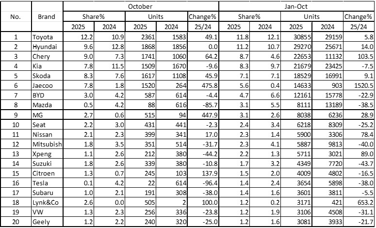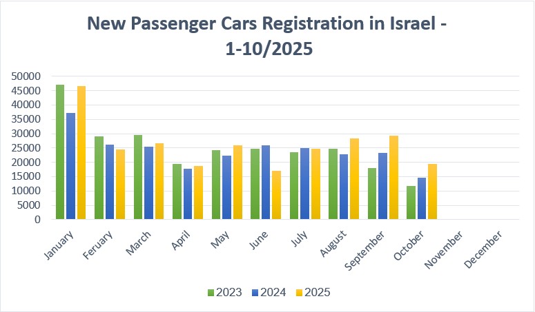 In October 2025, the Israeli passenger car market registered 19,367 new cars – an increase of 33.3% compared with October 2024. Since the beginning of the year, 261,404 new cars were registered, an increase of 8.5% in deliveries compared with last year. Since January 86,251 new cars with electric propulsion (BEV+PHEV) were registered. The market share of pure EVs currently stands at 20.1%.