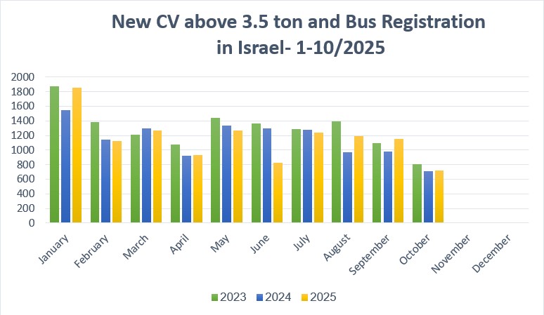 In October 2025, the Israeli market for CVs above 3.5 tons registered an increase of 2.3% in deliveries, with 723 new registrations, compared with 707 units in October 2024. Since January, 11,619 CVs and Buses have been registered, an increase of 1.1% compared with Jan-Oct last year.